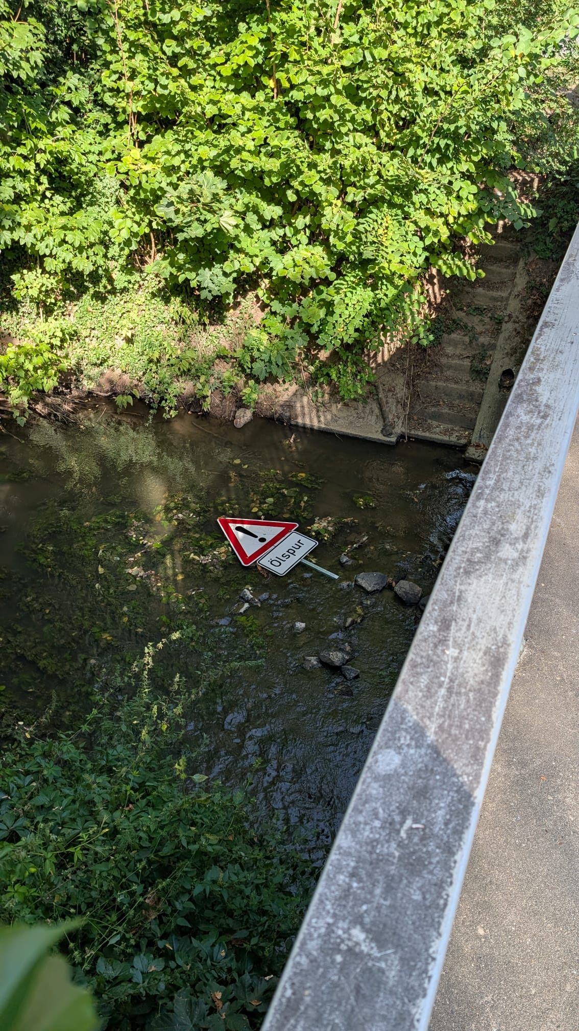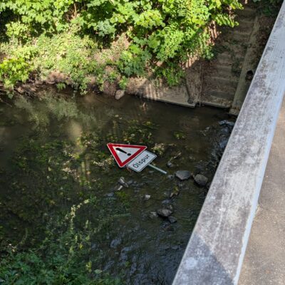 Ein Schild was zum Warnen für Teilnehmer des Straßenverkehrs diente, wurde mutwillig in die Bach geworfen.